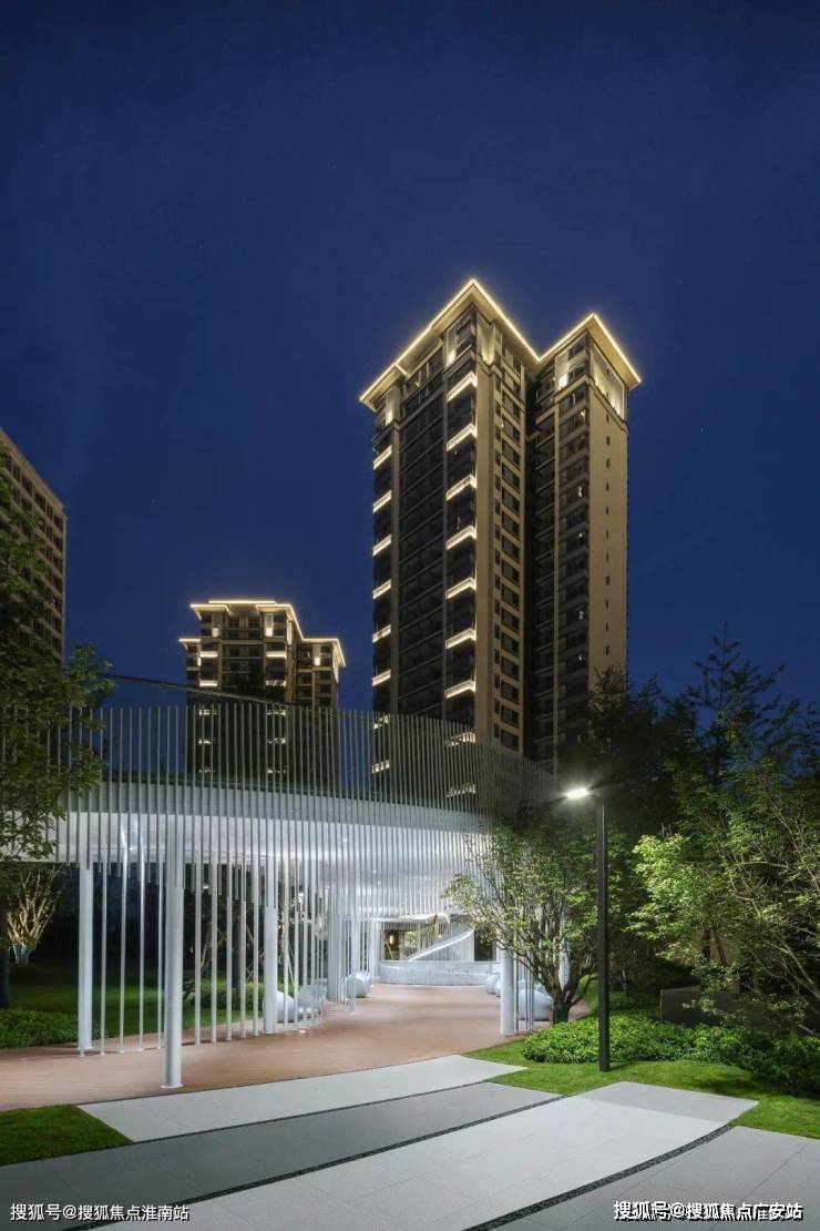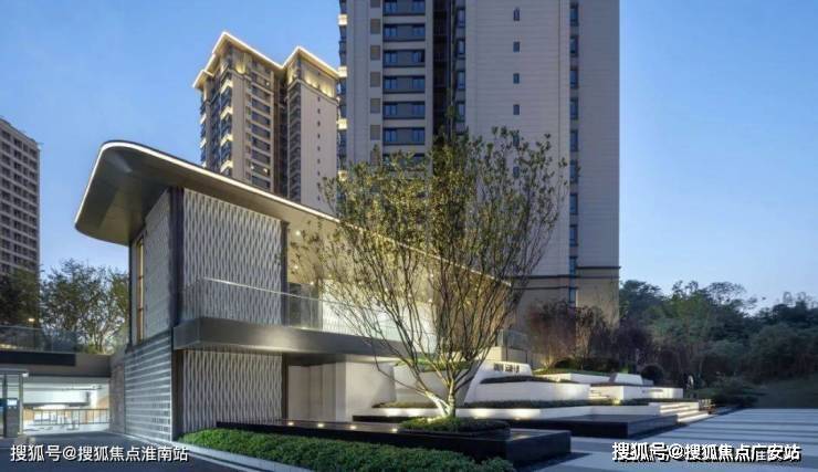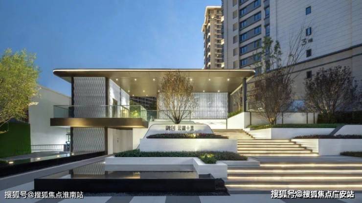 主入口拾级而上,即为主入口对景设设计。静态营造的水景,与入口的叠瀑水景相对应,如琥珀般晶莹剔透。静水、廊架,绿树,在班驳光影中慢下来,回家即是度假。