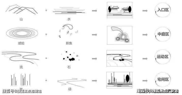 以诗情画意的文化气质、极致典雅的艺术生活、内心山水自然的回归三大理想环境为设计愿景,触摸璧山千年文化传承,惜品璧山“石泉凝脂”的浪漫情怀。以“艺解石泉之境,共享鱼悦涟漪之趣”为理念,从“珠岩百丈”、“琥珀跃鱼”、 “琼酱霜露”、 “暗香疏影”提取出“山”、“水“、“琥珀”、“跃鱼”、“流”、“石”、“林”、”径”等元素抽象为景观元素,落入入口、中庭、运动及宅间区域的设计之中。