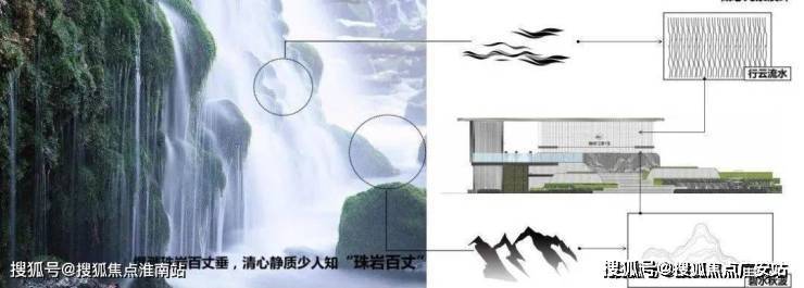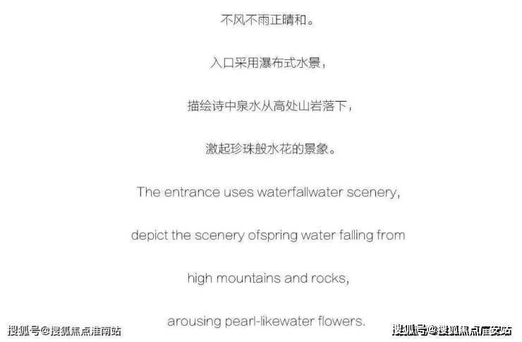主入口有将近4米的高差,在空间上使用阶梯状处理,同时结合瀑布式水景设计,既解决高差问题,通过景观处理进行视线引导,增加内部空间神秘感,又表达出诗中泉水从高处山岩落下,激起珍珠般水花的景象。入口门楼采用钢板定制水波浪格栅,以现代材质配合水韵波纹元素格栅,给予现代,舒适,自然的感受。