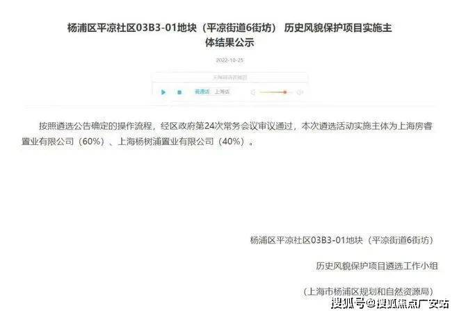 2022年10月25日,杨浦区人民政府官网发布公告,杨浦区平凉社区03B3-01地块(平凉街道6街坊)历史风貌保护项目实施主体结果公示:“本次遴选活动实施主体为上海房睿职业有限公司(60%)、上海杨树浦置业有限公司(40%)。”