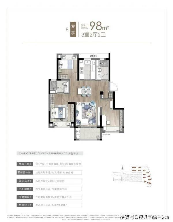 免责提示:此为建筑面积约98㎡标准户型示意图。样板展示间效果仅供参考,不作为交房依据。相同户型因楼栋、楼层、朝向等的不同,其立面设计、内部结构、管线管井布置、建筑面积等亦有不同。本户型图不作为要约或承诺,仅供装修参考示意,并非实际交付标准,房屋交付标准以双方签署的购房合同为准。本户型图相关功能区仅供展示,存在因政府规划变更或特殊户型而导致的差异。