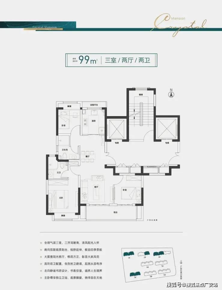 约99平三室两厅两卫为主力户型,三开间朝南,全明设计,南北通透;约6.3米大面宽阳台,视野、光线双丰收!