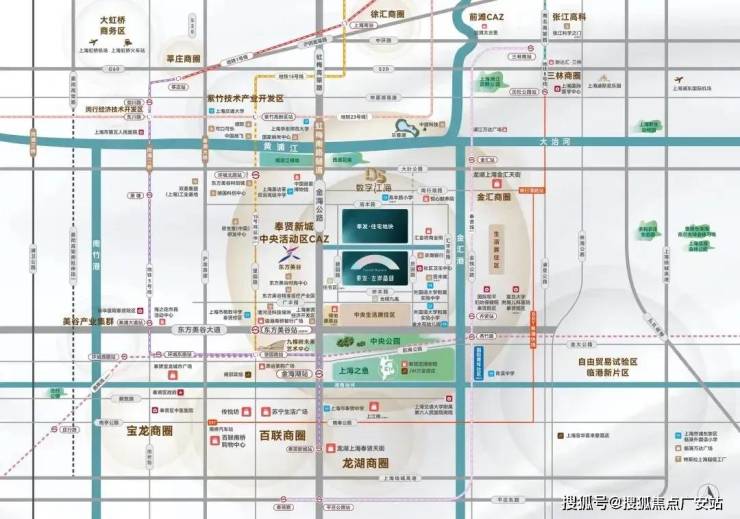 向南,依次坐落万亩中央森林公园、九棵树未来艺术中心、南上海体育中心(规划)、上海之鱼、龙湖奉贤天街......