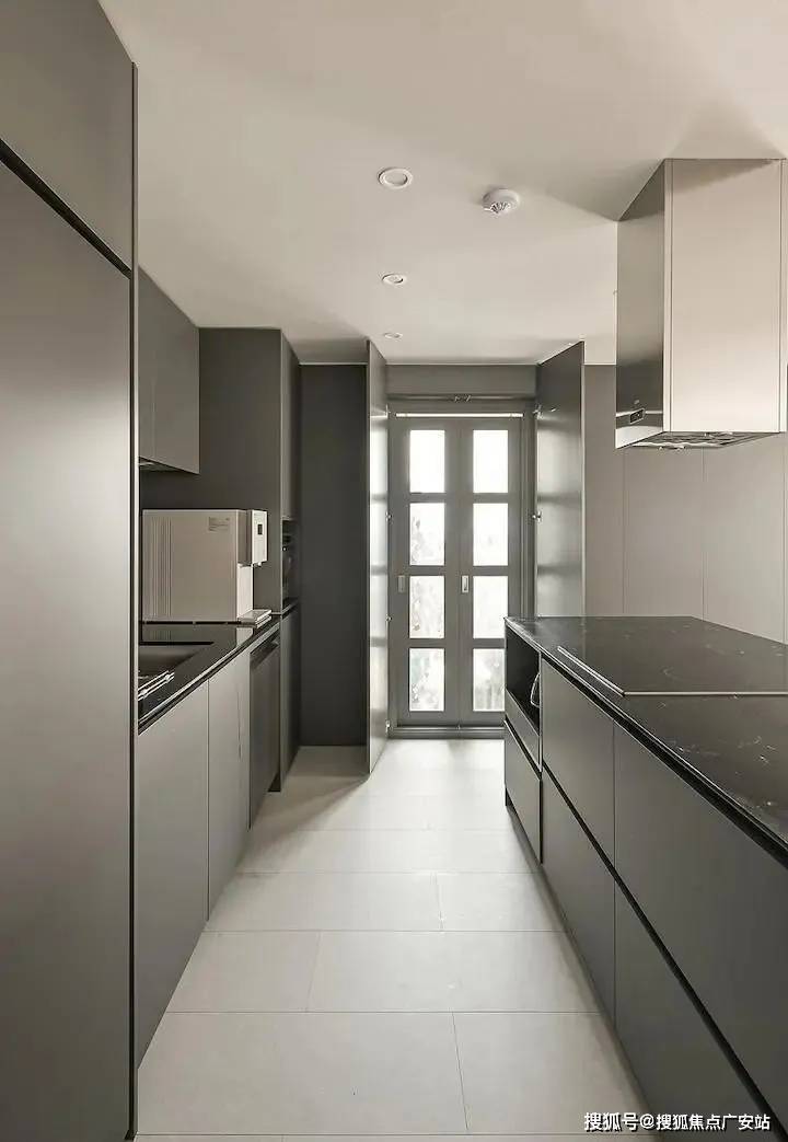 厨房双一字型布局,局部设高柜增加收纳,也能放下不少的杂物,地柜适当留空安置一些小家电,有条件的多留几个抽屉,分类收纳更加省心。