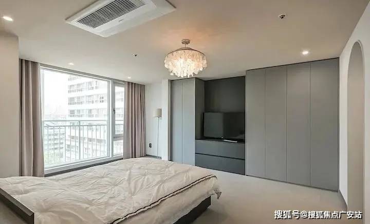 主卧床尾整面柜子,局部矮柜之上设电视机,不要觉得多余,毕竟躺着追剧的快乐不可多得,也不用担心和孩子抢电视机看。