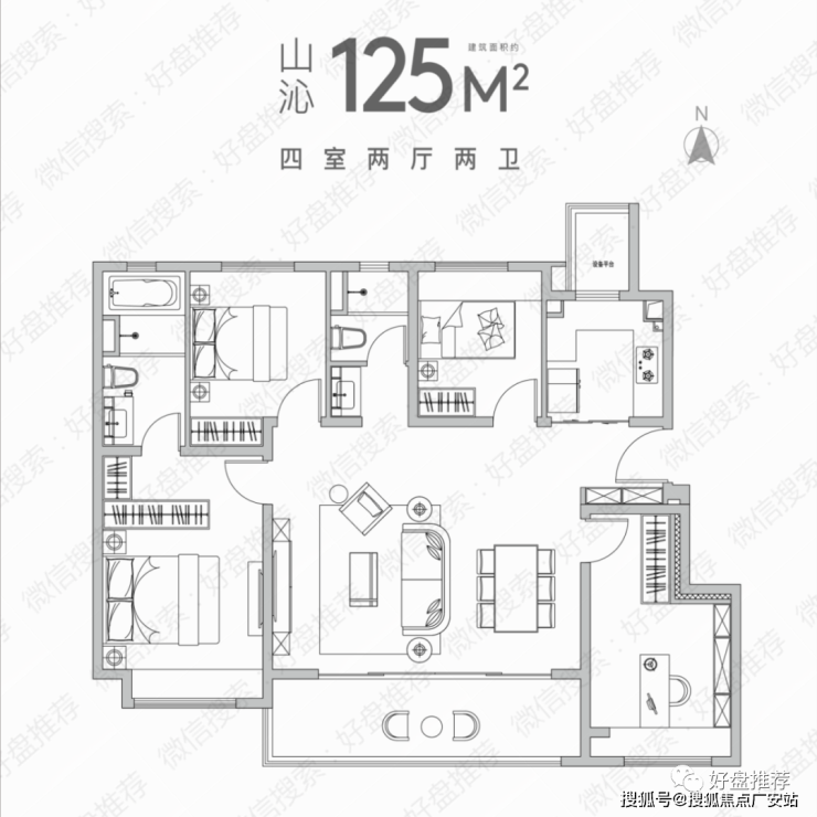 建面约125㎡的山沁,拥有四室两厅两卫,延续了约105㎡产品格局方正的优点,在南向尺度上则更上了一层楼。
