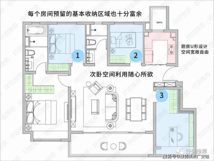 双卫设计,满足一家人的使用需求。客卫设计中,洗手台和淋浴间干湿分离,避免生活习惯的冲突,三代人相处也能应付自如。厨房也是大户型配置的U型设计,能让烹饪空间更加自由宽裕。