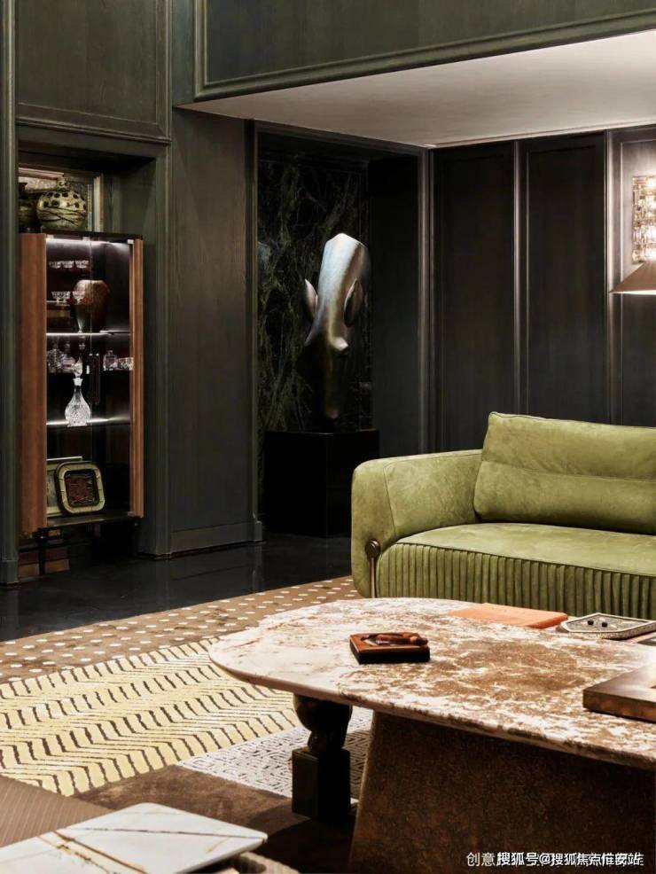 移步下楼,高约5.3m米的挑空客厅(层高约5.6米),四壁深色木饰面与液态金属,从天花板倾泻而下的水晶灯,灯光与目光汇聚范思哲黑石材壁炉前的坐席,营造如议院一般的空间感受,轻描淡写的话语,也掷地有声。