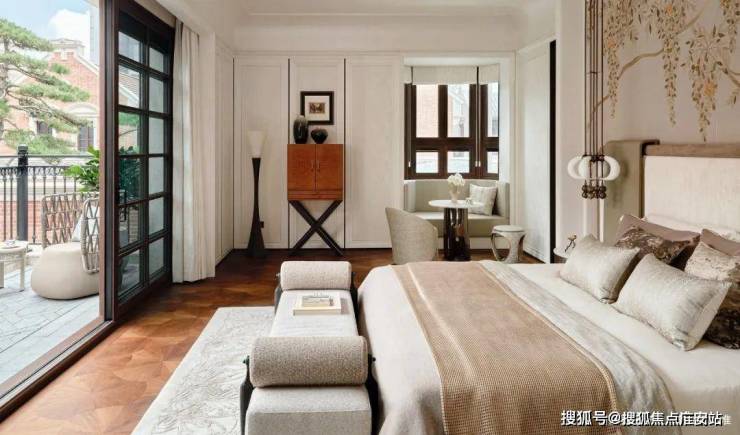 大宅的2F,充满戏剧的张力。推开主卧套房对开的玻璃木门,揭幕二人世界的情节,超大开间的卧室,将进深空间布局成露台、卧床、走廊三进的隔断,创造空间的主题感和层次性。先生与太太各自专属的衣帽间与梳妆台,即便是朝夕相处的爱人,也有意保持相对小尺度的私密体验,留有转身、擦肩、照面的邂逅感。