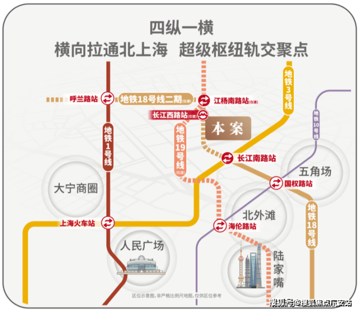 项目紧邻长江西路地铁站(在建),直线距离仅200米(北门至地铁站)地铁18号线横向拉通了原本纵向不相连的四线地铁(1/3/18/19),将北上海横向联通,成为区域轨交的交汇聚点。1站江杨南路,5站复旦,7站五角场,让您快速抵达城市的各个核心区域,畅享便捷的都市生活。