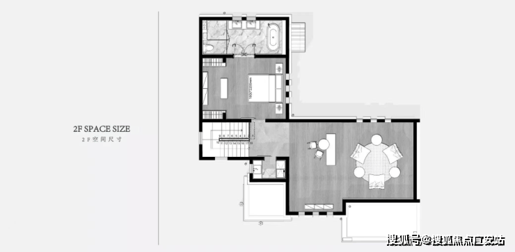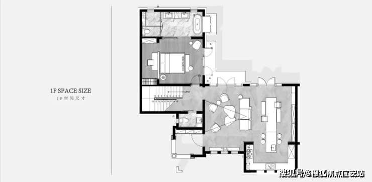 在这套别墅一楼,包含有会客厅、餐厅、开放式的厨房以及一间套房设计的卧室,然而这还只是这套90平米院墅的一楼部分。