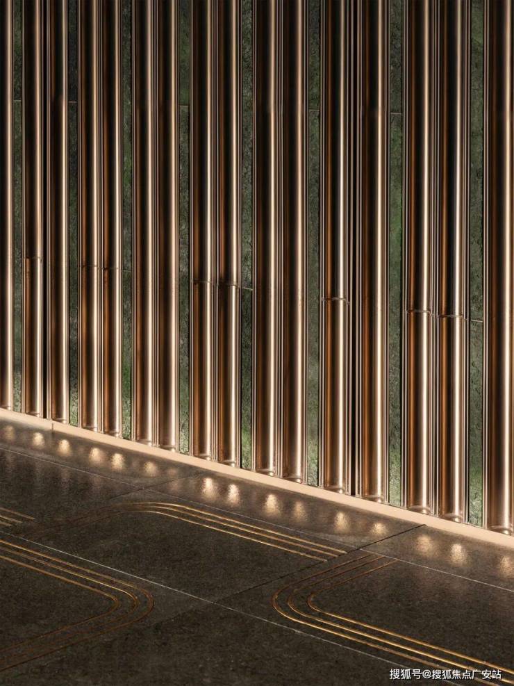 门庭背景墙为“三藏”之琉璃[璞熠琉璃],由“中国五大名器之首”琉璃铸就。经过800℃高温淬炼及数十道精细手工打磨抛光,以极其高昂的成本和匠人精湛的手作雕琢而成。晨曦中如霞光初绽,暮色下似流金沉璧,营造出琉光溢彩的归家之旅。