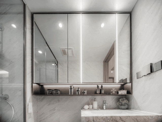 甚至还有 定制瑧悦专属女生卫生间,为女主人精心打造了 镜下收纳柜、金属收纳龛、侧面收纳龛等多个大进深收纳空间。