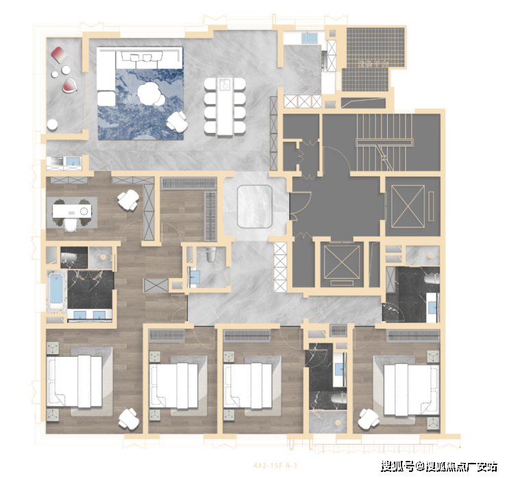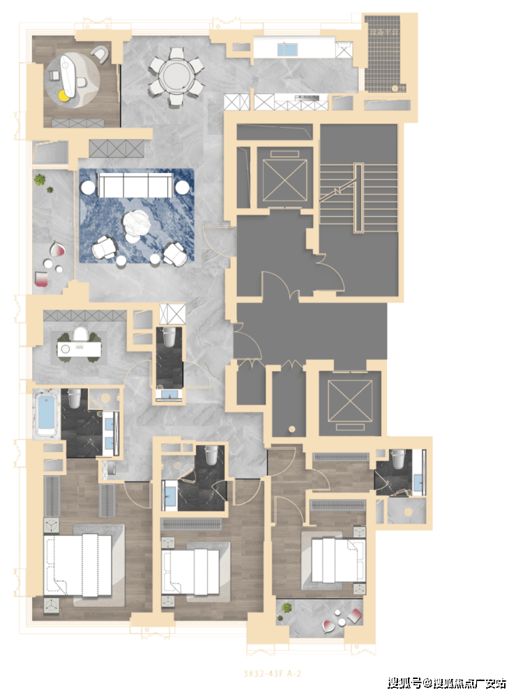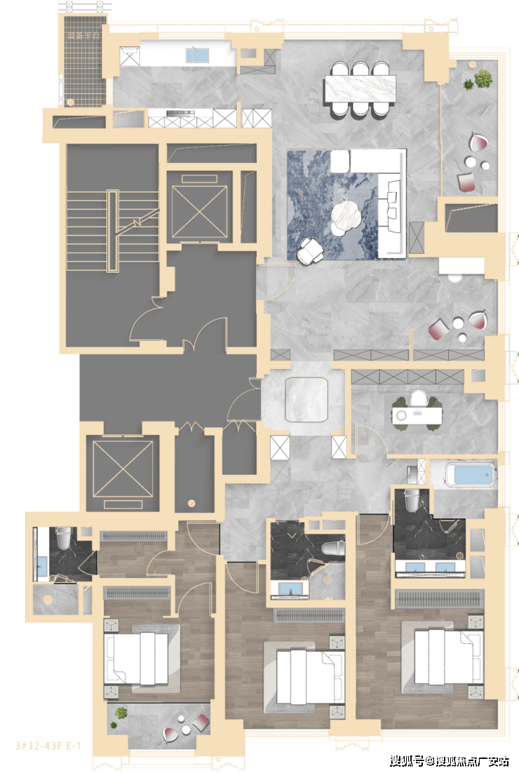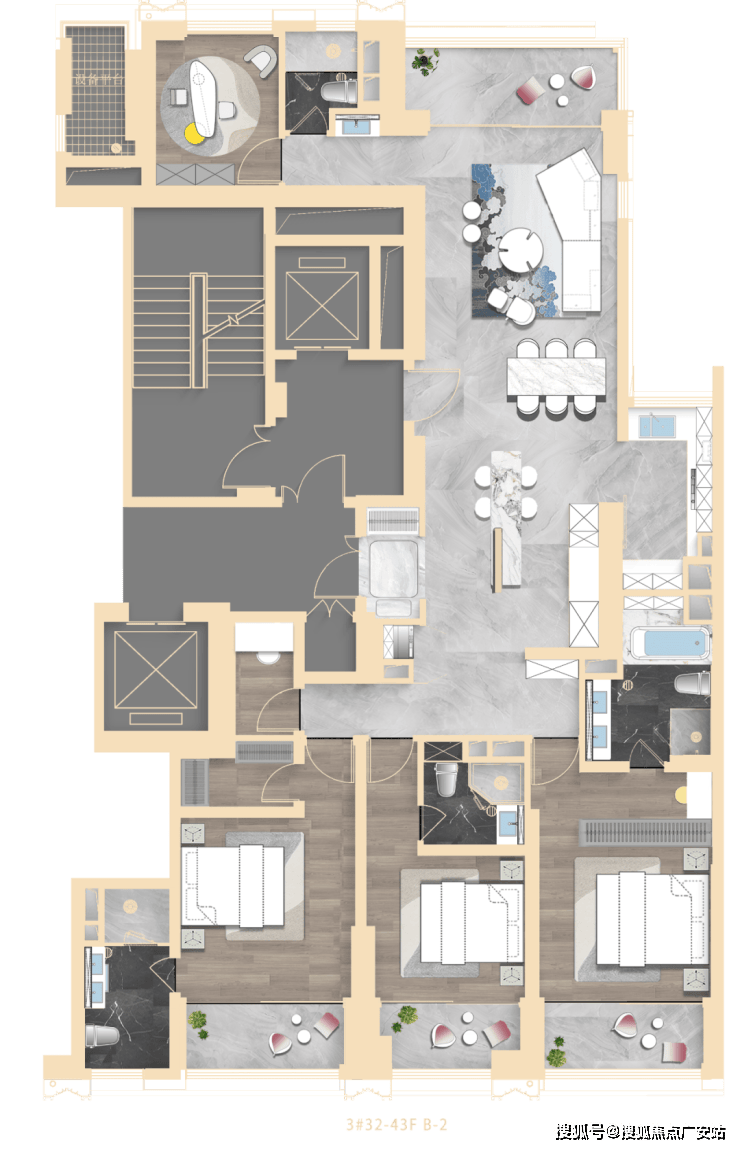 因为寸土寸金,市中心项目不会有太集中的中心景观。而海玥黄浦源,因地制宜进行“一星四叶”的建筑排布,围合出了市心少见的约3000㎡集中景观。