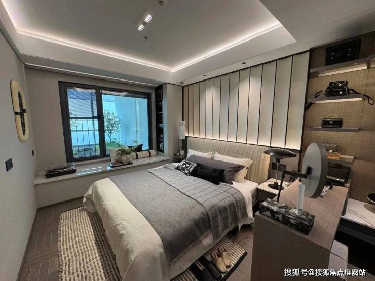 国誉府这个98㎡是飞机户型,本身比动静分离的三房空间利用率要高一些,加上又是纯洋房,天然的高得房率,因此这个主卧尺度感非常好,比一般户型主卧更大、更方正,主卧床头背景墙也是交付标准。