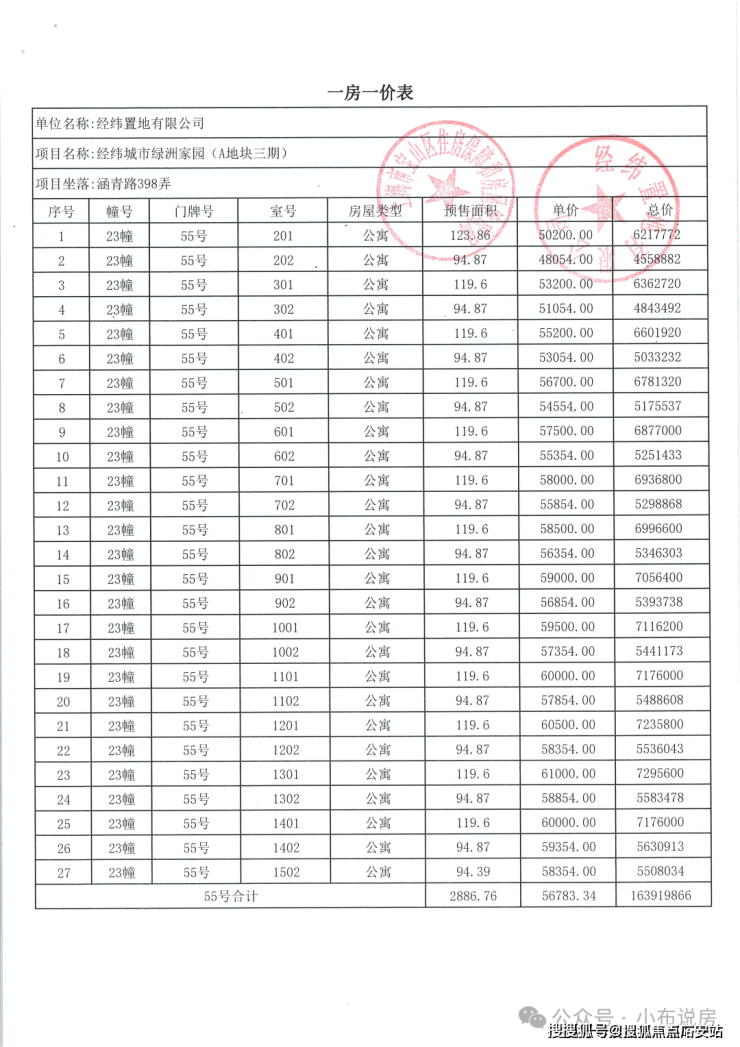 完整一房一价表如下: