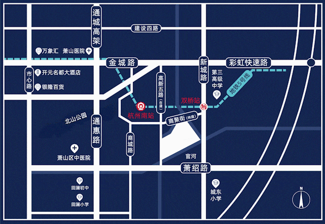 约1000米至金城路(萧山主城核心轴线),约1500米至彩虹快速路(2021年贯通,约15分钟车程直达滨江核心),约20米至萧绍东路(萧山绍兴双城主脉)。
