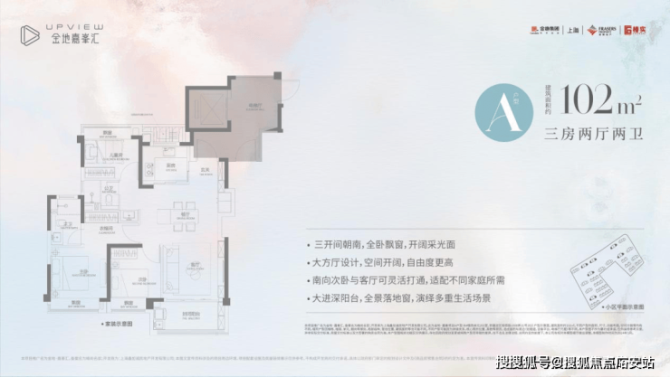 A户型是建面约102㎡3房2厅2卫,该户型三开间朝南,采光效果上佳。 大方厅设计,空间开阔自由度更高。南向次卧和客厅可灵活打通,适配不同家庭所需;大进深阳台+全景落地窗,让室内的通透性和视野可圈可点。
