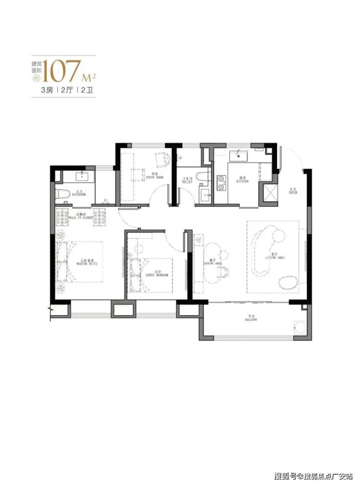 产品:103㎡、107㎡的三房两厅两卫及123㎡、129㎡的四房两厅两卫。