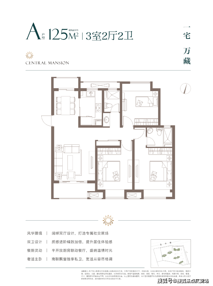 主力:60㎡1 房、90㎡2 房、125㎡3 房,户型方正、南北通透、动静分区,空间利用率高