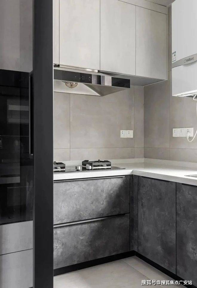瓷砖通铺到厨房,用了同色系的灰调柜门,简单干净易打理。