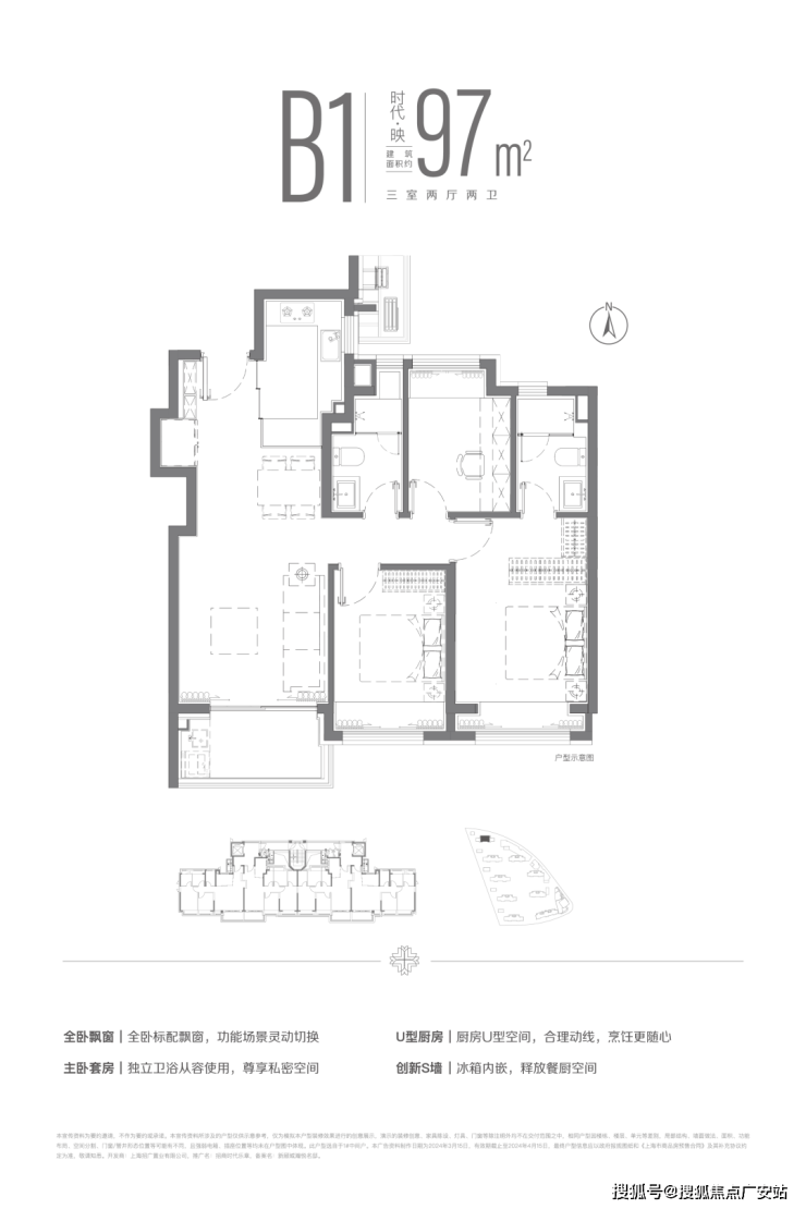 建面约97m²三房两厅两卫户型,全卧+主卫飘窗配置,并通过飞机户型空间布局,提升了空间的使用效率,让温情在自然中自然发生。
