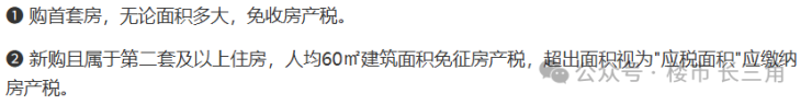 有本市长期居住证满3年可免交房产税(如只满1年先交2年到满3年可退前面2年交的房产税)。购买的第二套及以上住房在合并计算家庭全部住房面积后,给予人均60㎡的免税面积扣除。
