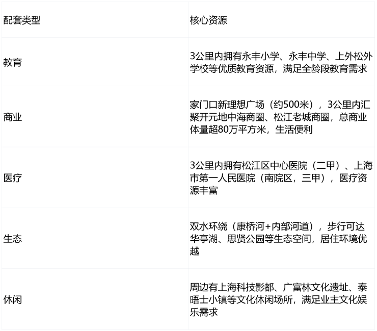 北侧紧邻松江区人才幼儿园(公办优质)、东华大学附属实验学校(优质公办)