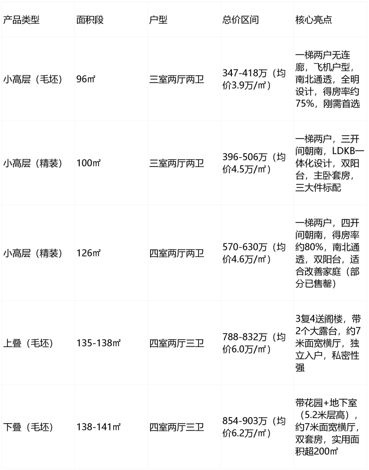 产品多元化:主打96-125㎡精装高层(341万起)和135-141㎡毛坯叠墅(600万起),覆盖刚需至高端改善全客群