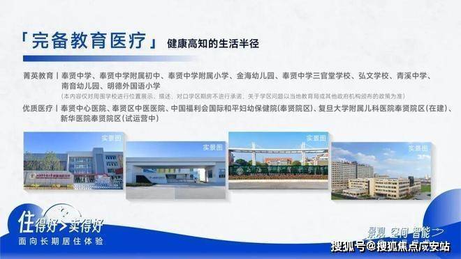 优质医疗:奉贤中心医院、复旦大学附属儿科医院奉贤院区(在建)、奉贤区中医医院、中国福利会国际和平妇幼保健院(奉贤院区)、新华医院奉贤院区(试运营中)