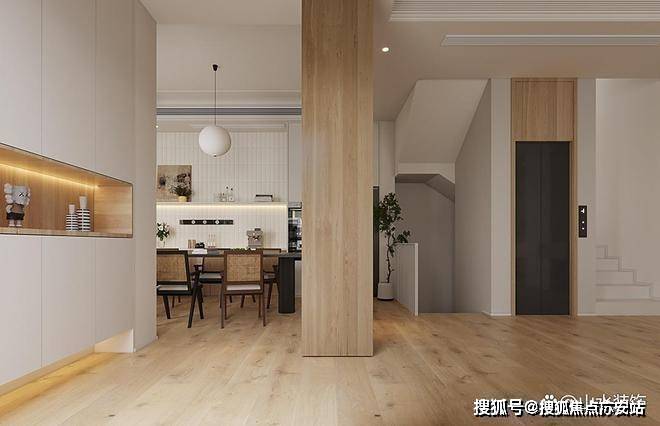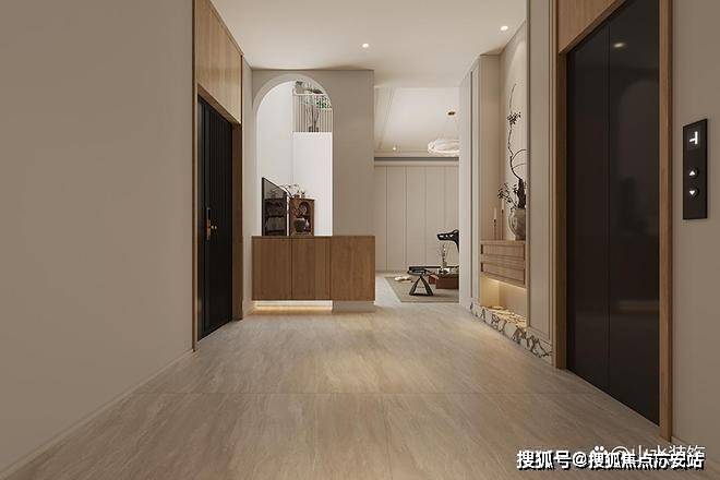 楼下二层由车库入内,是一个宽敞的门厅。在保证空间通透性的基础上,我们增设多功能储物柜和端景,将收纳与装饰融为一体。拆除部分墙体,改做圆拱门洞,下方正好定制悬浮玄关柜,形成通而不透的布局。木质的端景台搭配着大理石地台,斜插的干花疏影横斜,勾勒出艺术气息。