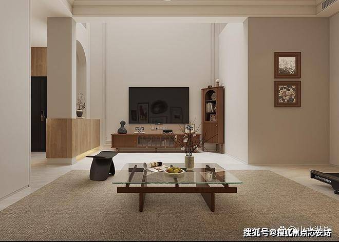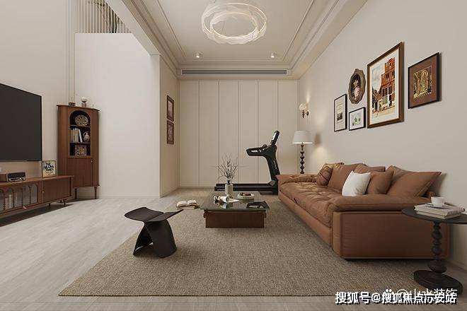 负二楼的休闲区不大,改多功能设计。沙发、茶几、电视的经典组合,围合出休闲与观影场域。角落处的高脚细腿实木柜是装饰与收纳的完美融合,胡桃木的材质引入法式复古的气息。