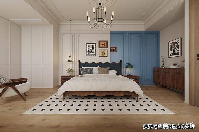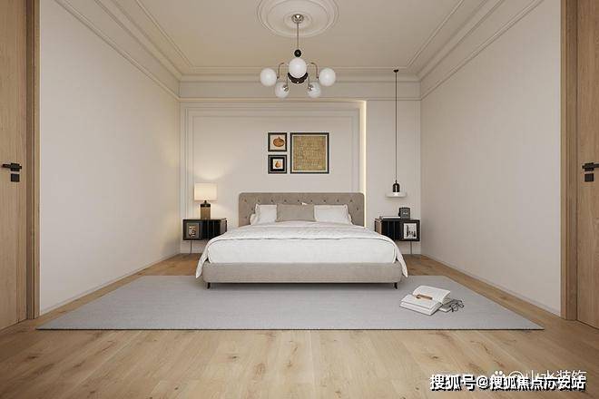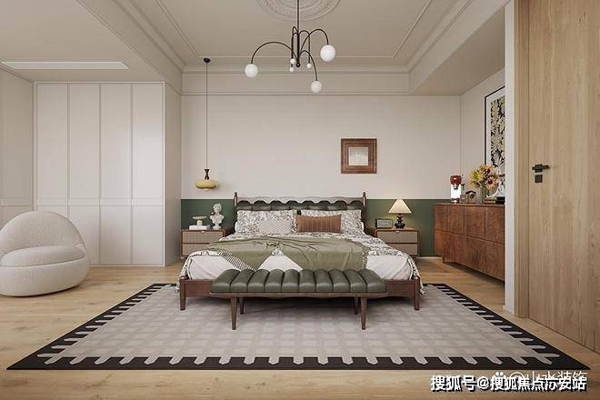 上海浦东绿宝园·翡梵售楼处电话☎:400-8118-224(预约看房热线)按照居住者的要求,对三楼布局重新优化,将过道扩充进主卧室,改多功能套房。主卧室的睡眠区域我们在暖白基调中,加入绿色拼接,丰富视觉层次,也多了些法式复古的韵味。带角花设计的石膏线做双框设计,简约利落,使得墙面有了多维立体的视觉效果。