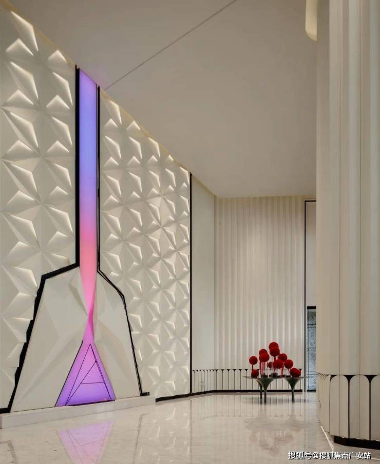 步入挑高约11米的一楼大堂,折线通高墙面与钻石切割前台 ,像极了兰博基尼发动机的散热鳍,又似来到澳门七星级酒店摩珀斯。