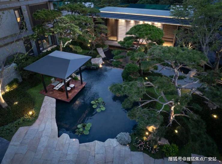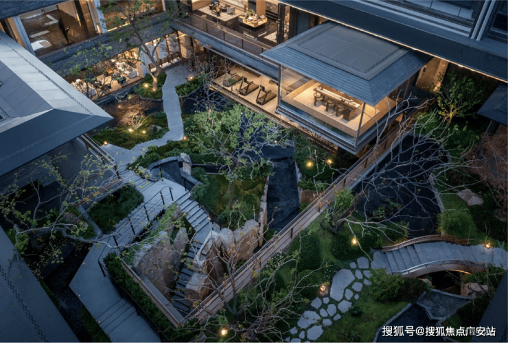 而最令人惊艳的,当属约6米地势差打造的下沉式山水庭院,山、石、水、林有序交织,犹如一幅“豁然开朗”山水轴卷,每一步皆是景致,每一处皆有不同。