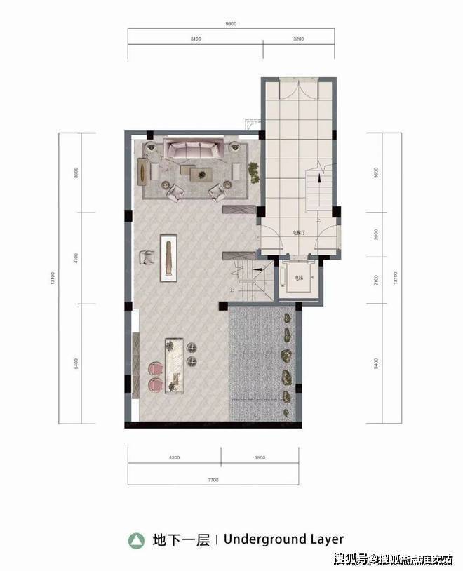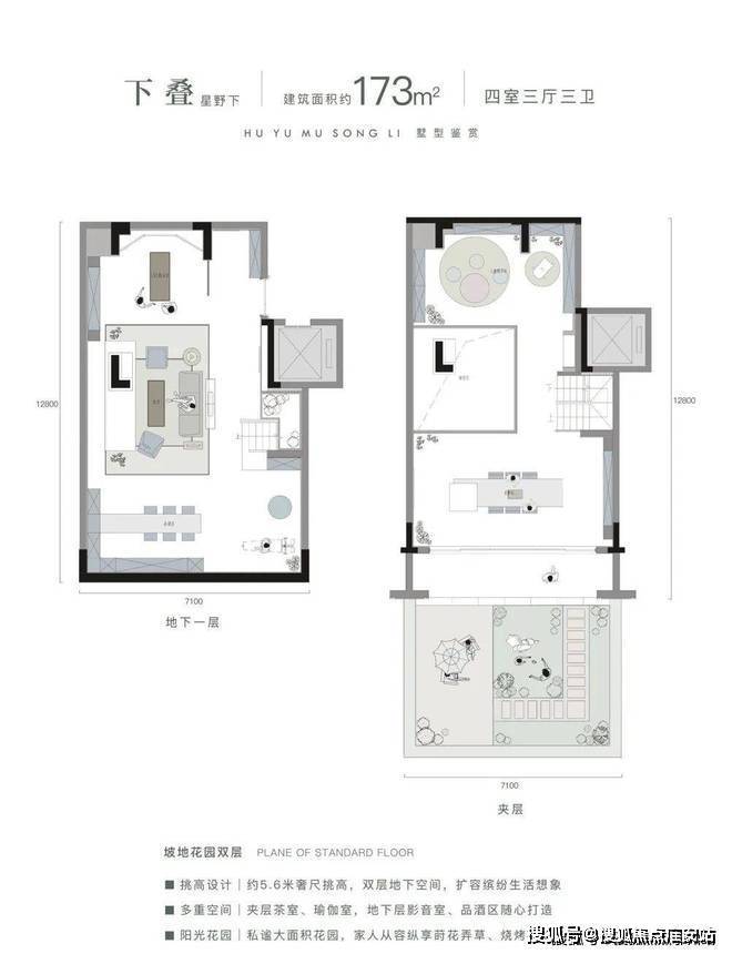 因为特殊的坡地处理,所以有天然的地理高差,地下层与一层自然贯通,形成两个首层,使原有“地下层”跃然平面之上,成为稀有的“阳光院落层”。