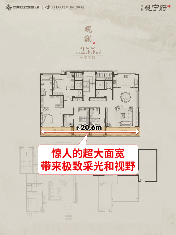 建面约255㎡平墅, 豪奢南向面宽高达约20.6米 ,惊人的超大面宽,带来极致采光和视野。