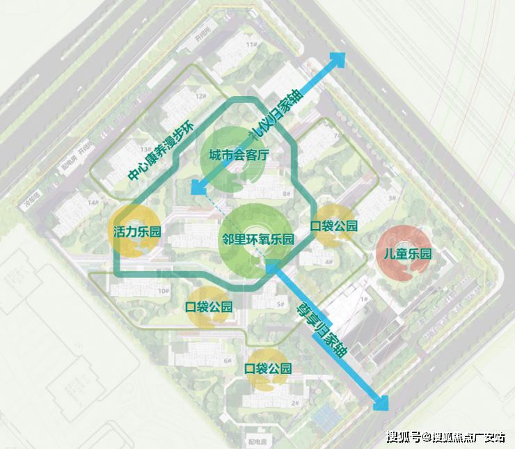 引入大公园概念,以“一带两轴多节点”的连接方式,打造公园社区,实现景观资源自有共享,营造满分“绿色公园街区”系统。并打造“社区公园——礼仪大堂——邻里花园——入户花园”四重归家礼序,创造最具有特色的全龄化、人性化的氧气社区。