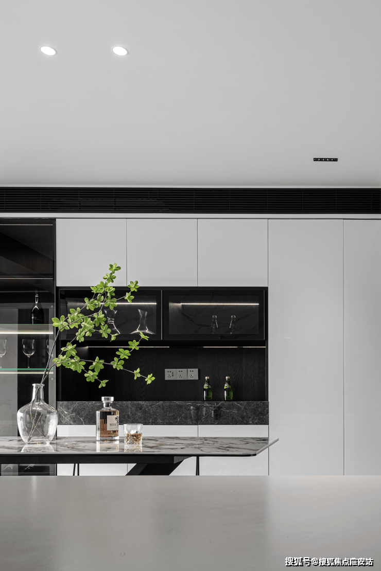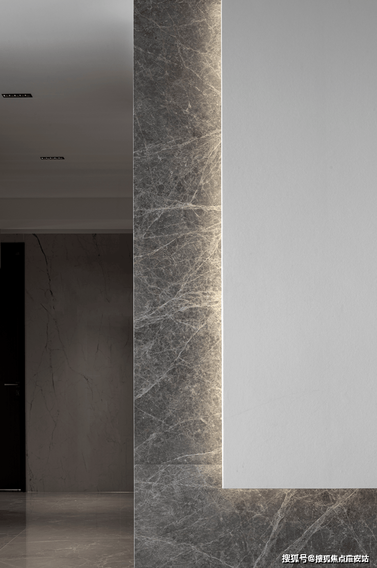 灰白色的整体调性,营造出安静惬意的居家感受。客厅采用爱马仕灰大理石,细腻的石材纹理质感,层层递进,开启视觉延展。