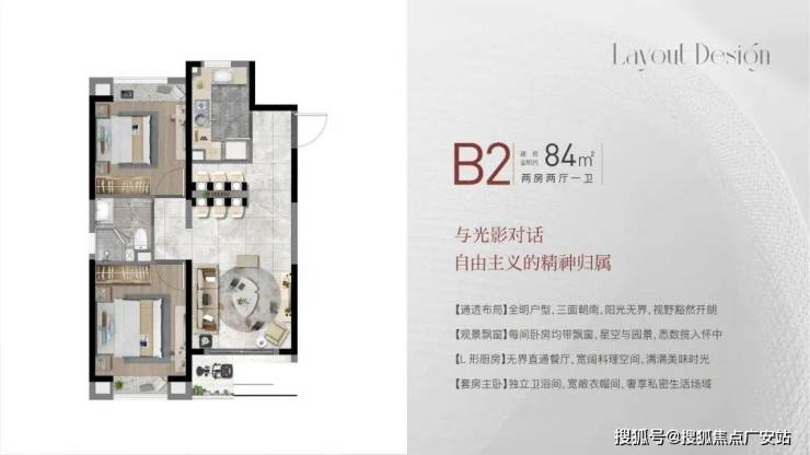 建面约84㎡2房2厅1卫,做到了双开间朝南+双卧室带飘窗+动静分离,非常宽敞的2房户型。