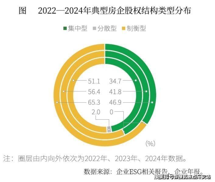 在股权结构方面,房企股权结构优化,制衡性股权结构占比持续提升。根据对49家典型房企股权结构统计,第一大股东控股比例在50%以上的集中型股权结构房企有17家,占比约34.7%,较上年下降约7.1个百分点;第一大股东控股比例介于10%~50%的制衡型股权结构房企有32家,占比约65.3%,较上年提升约8.9个百分点。