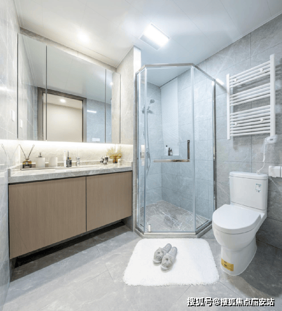 卫浴间细节也让人眼前一亮,主、次卫的镜柜,整齐收纳日化用品,预留的插座让电动牙刷、剃须刀、吹风机等电器的使用十分便捷。悉心配置的水暖电热毛巾架,随时为毛巾杀菌消毒,给予安全保障,更有人性化的科勒卫浴套装,带给家人最贴心的呵护。