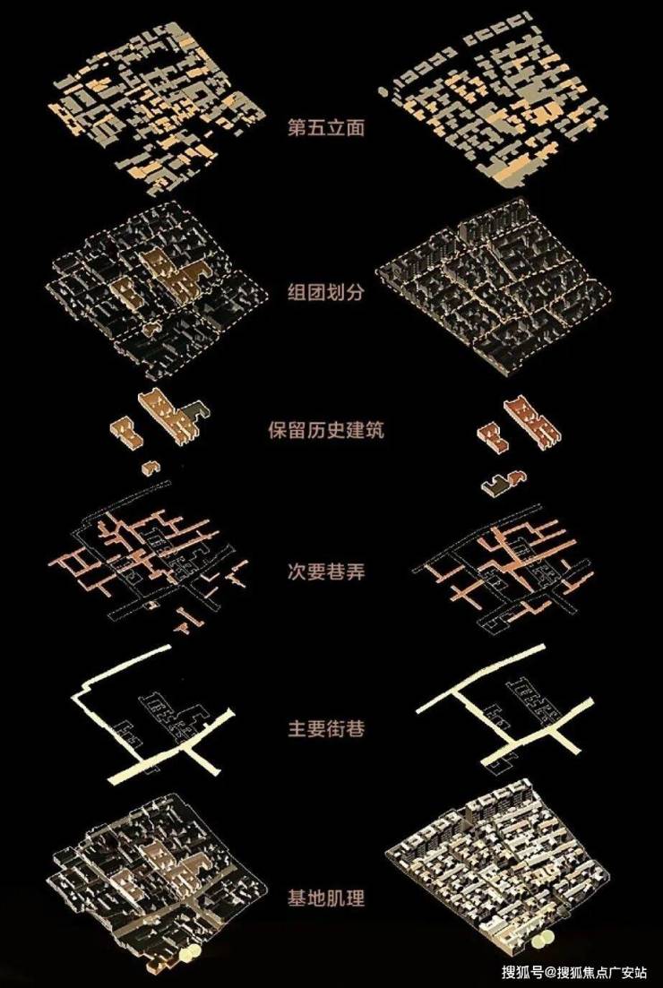 以一个街区为例,提取原有街巷的天际线、色彩比例和开窗位置,最终将这些元素转化为润园的设计语言。