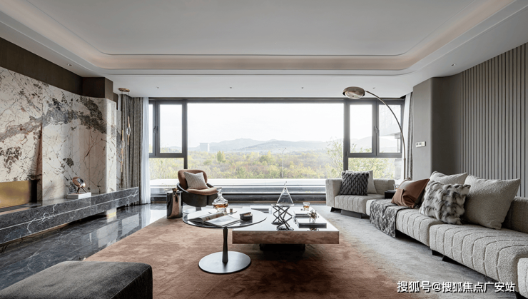 一层公区以“通透”为核,整面落地窗将户外光线引入室内,形成流动的光影剧场。