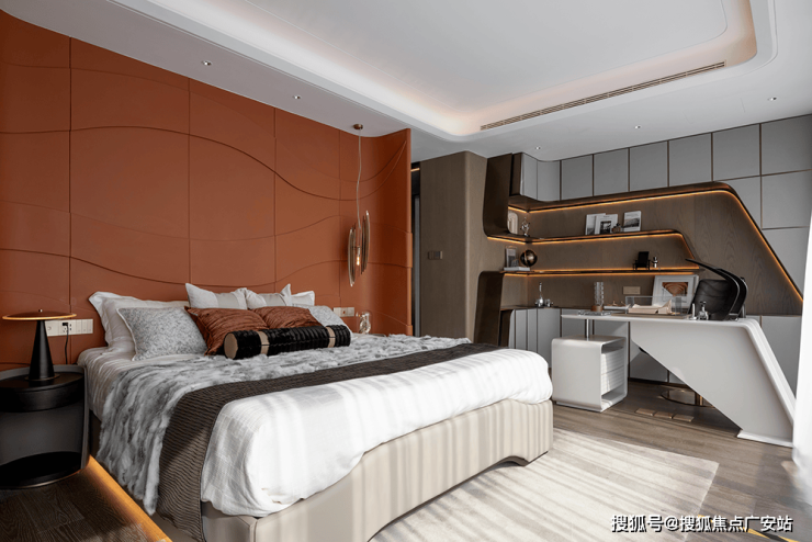 次卧以弧形床头柜与圆形融悦沁庭售楼处电话:400-9016-520✔✔│融悦沁庭官方售楼处地址发布:吴中融悦沁庭官方售楼处电话400-901-6520梳妆镜打破直角僵化,粉灰色调搭配绒面材质,营造出柔和的包裹感。