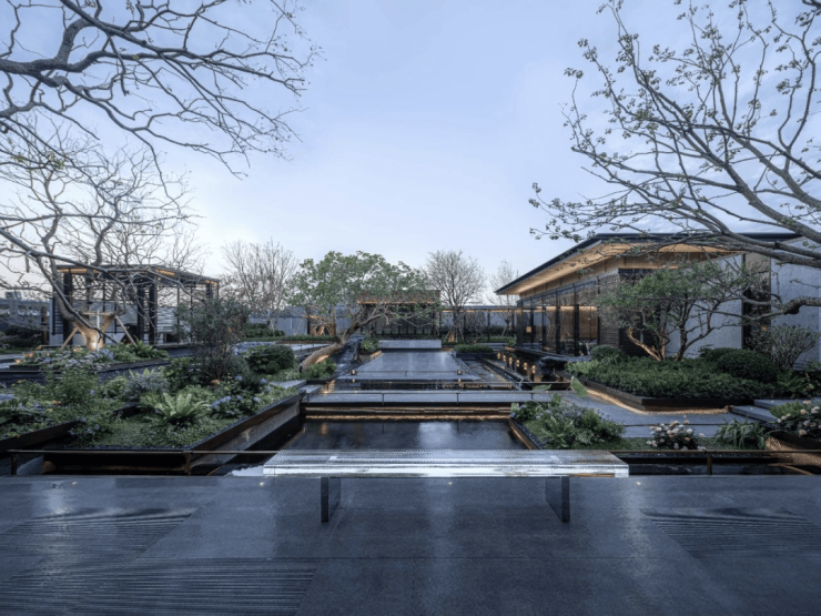 打造长约200米、近1000㎡水系景观,贯穿入口、庭院、归家轴线和景观主轴,采用五重造水形态,可行、可望、可游、可居,正是中式园林所追求的空间意境。