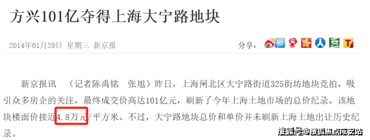2014年1月土拍,上海闸北大宁地块出让,最终被金茂拿下,楼板价接近4.8万一平,甚至超越了周边的二手房价。