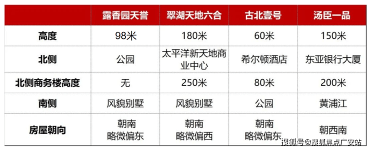 楼典横向对比了上海指标性的亿级空中平墅产品——翠湖天地六和中间套约454-461㎡、古北壹号约482㎡、汤臣一品约434㎡与露香园·天誉约489㎡的各项参数,这三个产品的一手、二手价格均在亿级或以上,得出以下结论: