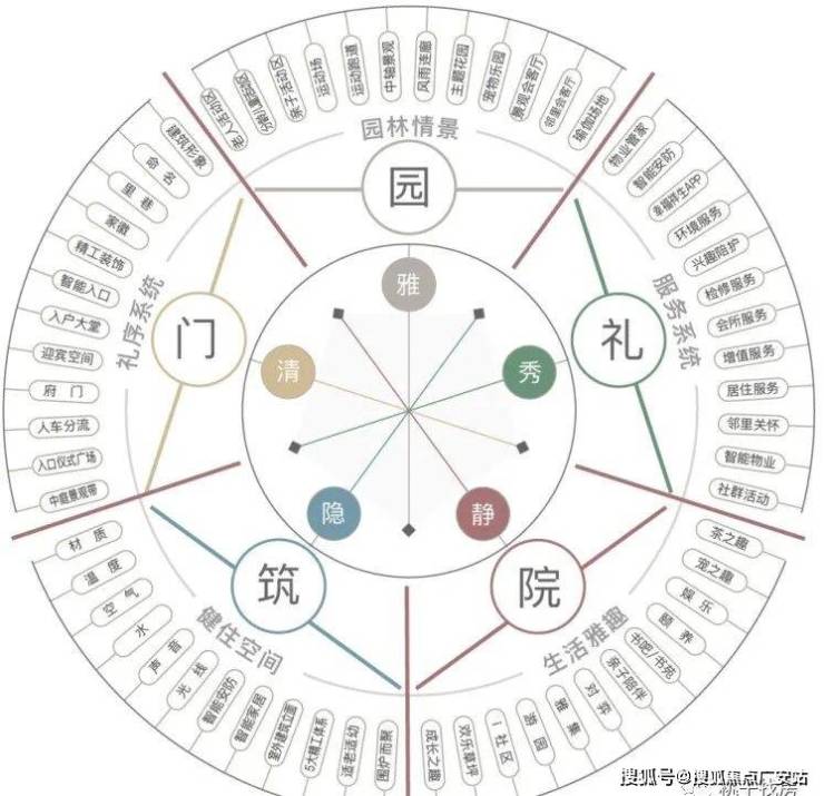 提炼东方建筑美学中的清、雅、秀、静、隐对应五音,形成“府系”产品的精神基因,而其在产品物理层面的表现则彰显出五个核心价值主张,即门—礼序系统、园—园林情景、礼—服务系统、院—生活雅趣、筑—健住空间: