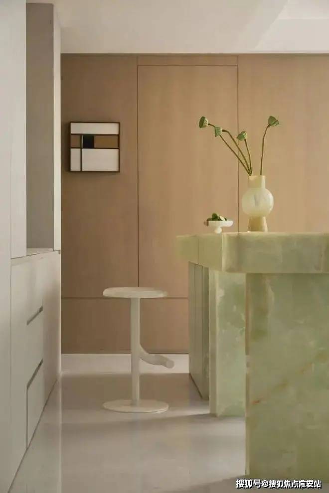 西厨岛台的设计具有强的视觉重心,运用温润的青玉做整个体块的包裹,结合了立柱与镂空的设计,使得整个空间看起来更加透气和谐。